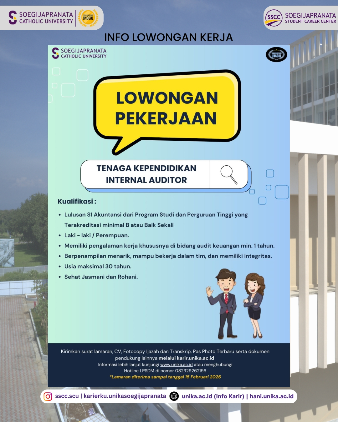 Soegijapranata Catholic University is now hiring for Tenaga Kependidikan Internal Auditor